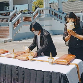 เวลา 12.00 น. เริ่มประกอบพิธีทางศาสนา ทอดผ้าไตรบังสุกุล วางดอกไม้จันทน์