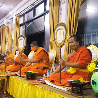 เวลา 11.00 น. ถวายภัตตาหารเพลแด่พระสงฆ์ เชิญเเขกรับประทานอาหารกลางวันร่วมกัน